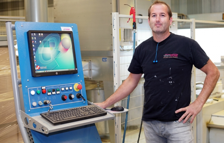 Eric Frowijn is 25 jaar in dienst bij Ventistone. Eric is inmiddels de derde werknemer die 25 jaar werkzaam is bij Ventistone.De algemeen productiemedewerker heeft veelzijdig werk, vertelt hij. ‘Ventistone is een klein bedrijf dus ik heb best veel taken en dat vind ik prettig. Ik doe veel freeswerk met de CNC machine. Dat is een computergestuurde freesmachine waarmee we de contramallen voor de neuslatten maken. Ik ben ook veel bezig met het verlijmen van platen en doe zaagwerk. En ik maak de producten verzendklaar. De koerier komt hier dagelijks langs om producten op te halen, we hebben het druk. Ja, zo hou je het best 25 jaar uit, het is leuk werk.’