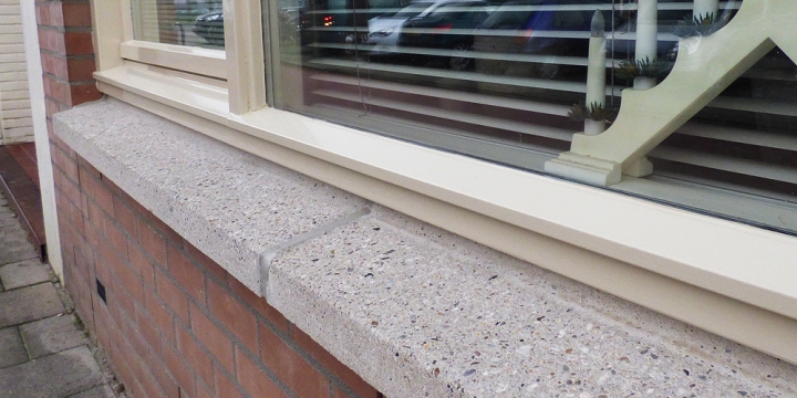 De ondergrond van de houten kozijnen is kaal gemaakt en gegrond. Daarover heen zijn de Ventistone profielen aangebracht. Van de kozijnen zijn de onderdorpels bekleed. Bij de erkers de onderdorpels en ook de stijlen. Geen rechttoe-rechtaan project, aldus Van Doorn. “Voor een goede aansluiting van de uitwendige erkers zijn de profielen in verstek aangeleverd. Ventistone moest dus alle profielen op maat maken, er zat geen seriewerk bij.”