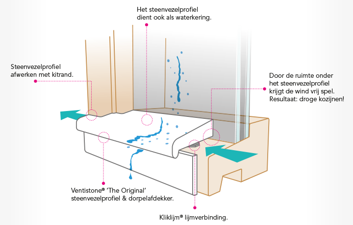 Het principe van het systeem is eenvoudig, maar doeltreffend en werkt als volgt: Door het aanbrengen van Ventistone profielen blijft het onderliggende kozijn droog. De afstandhouders tussen het profiel en kozijn zorgen voor een optimale ventilatie. Samen zorgt dit voor een blijvend droog kozijn.